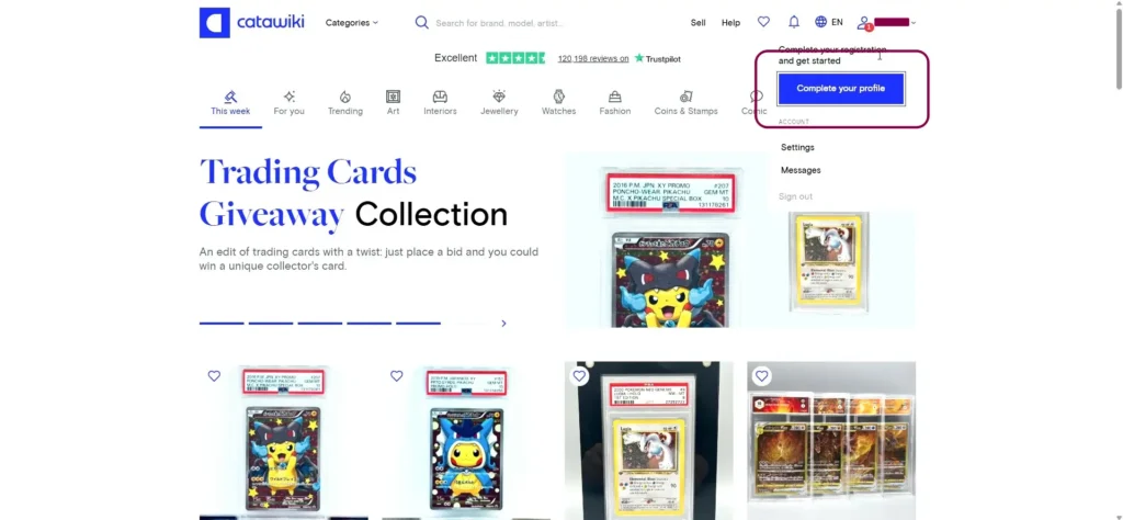 入力項目が揃っていない場合、トップページ右上にあるアカウントメニューにカーソルを合わせてクリックすると「Complete your registration and get started.」という文とともに「Complete your profile」と書かれたボタンが表示されます。