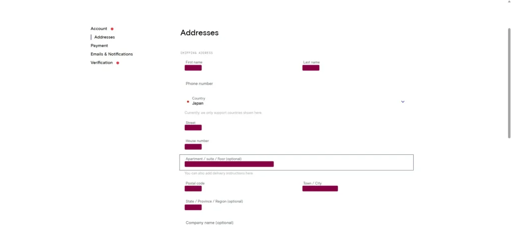 「Apartment / suite / floor(optinal)」には、登録する住所の建物名と部屋番号。