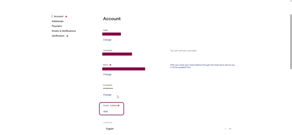 そこに表示されている入力項目のなかから、「PHONE NUMBER」の項目を探し、「Add」と書かれている部分をクリック。