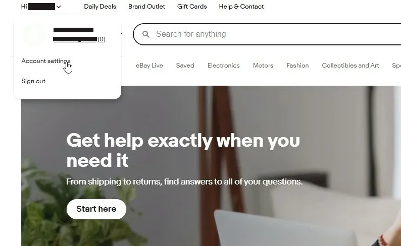 ebay.comの画面を開き、左上の「Hi 〇〇!」にカーソルを合わせ、「Accouunt settings」をクリック。
