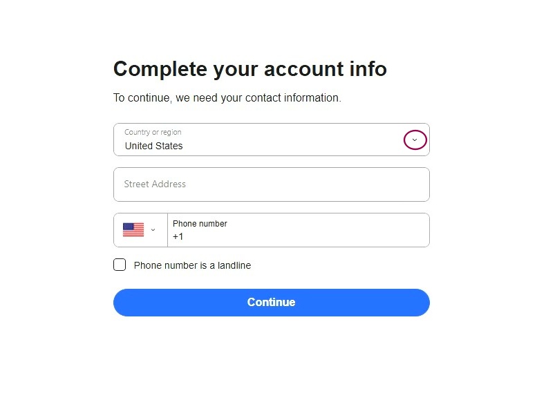 「Provide your contact info(連絡先を入力)」の画面が出たら、トップの「United States(アメリカ)」を「Japan(日本)」に変更したあと、次のように入力します。※以下例