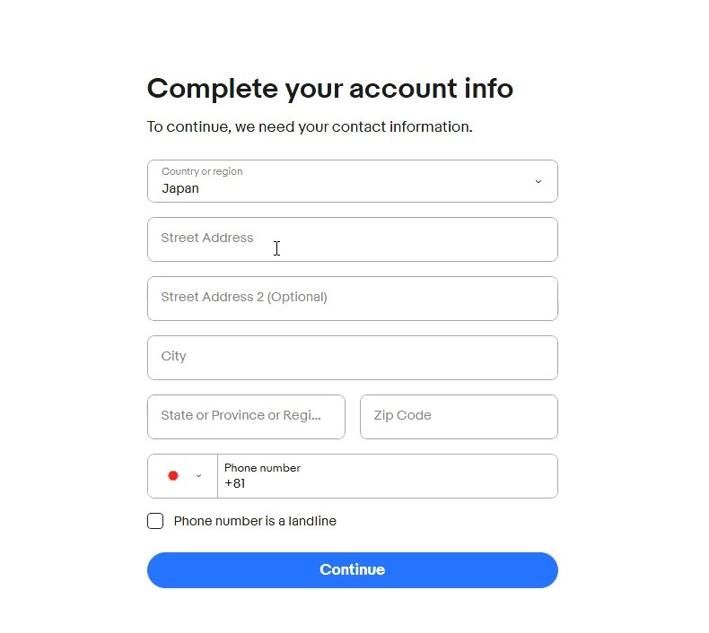 - Street address 2(Optional):部屋番号、建物(例:301,〇〇Mansion)