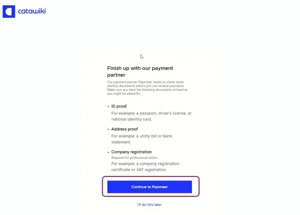 すべて準備できたら、下部にある「Continue to Payoneer」をクリックしましょう。