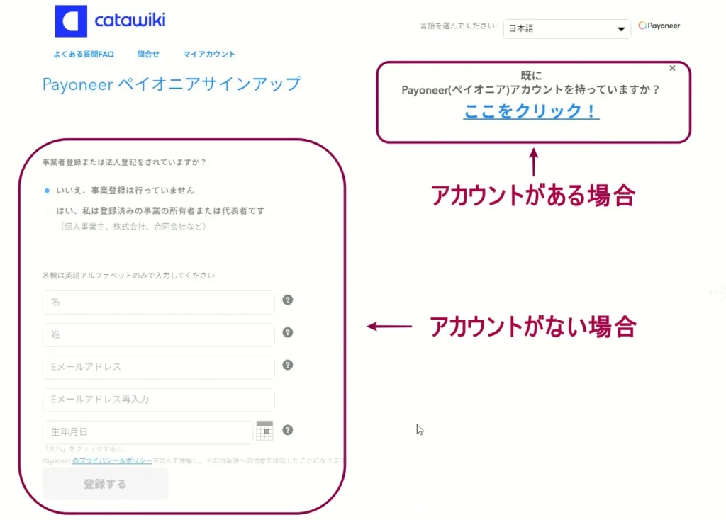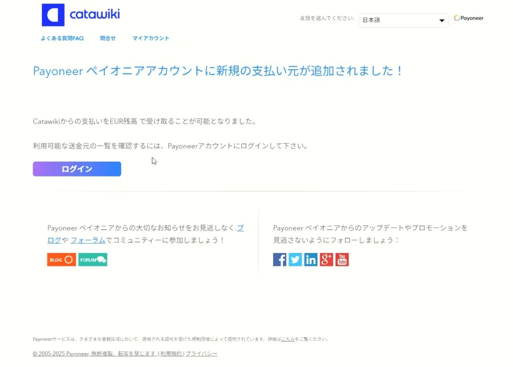 通常は、catawikiのガイド通りに進めていけば、Payoneerへそのままログインできます。